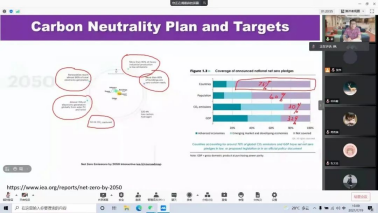 本次论坛由日本名古屋大学薛进军教授主讲。他以《碳中和与能源转型》为主题,系统分析了碳排放与气候变化、碳达峰、碳中和、能源转型、碳市场等相关问题。薛教授指出,全球二氧化碳总量在不断上升。从碳排放来源看,碳排放主要是由于化石能源(特别是煤炭)的使用,如果以2014年作为基线,以2060作为碳中和目标实现年份,现有化石能源的比例要从目前的82%下降到35%;煤炭的使用要从目前的使用减少72%;石油要减少45%;天然气要减少26%。为实现碳中和的目标,能源结构要发生巨大变化。薛教授同时指出,通过碳市场机制促进节能减排,也有利于实现碳中和。与碳市场相关密切的是碳价问题,合理的碳价可以促进节能减排,当碳价不能足够高或者足够低,就无法对企业产生足够的刺激去买或卖碳,从而不利于实现碳中和。